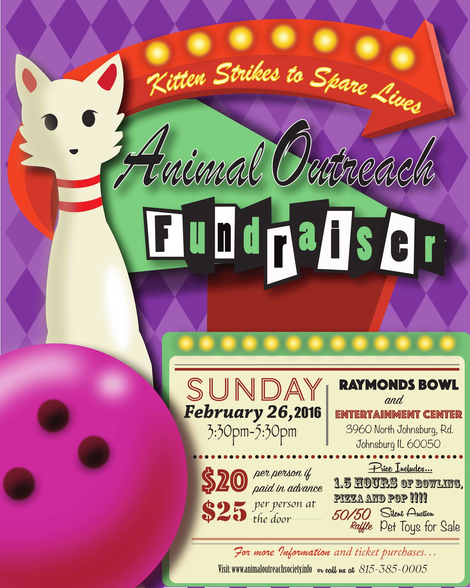Join other Animal Outreach supporters for a good time bowling for the animals and enjoy 90 minutes of bowling and pizza and pop. We'll also be having a 50/50 auction, and be selling Pet Toys.